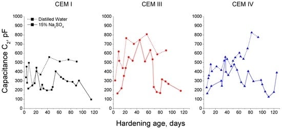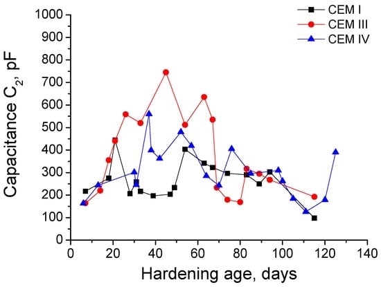 The low frequency capacitance C2 has been associated with the pore surface in contact with electrolyte present in the material and it is related to the formation of CSH gel layers, which occupy the pores []. The hydration and pozzolanic reactions products are deposited on the pore surface and they increase the specific surface of the pores [], because these products form rough structures. Moreover, it could be expected that those rough structures would progressively destroyed when the sulphate attack is advanced enough, which would imply a reduction of the capacitance C2.