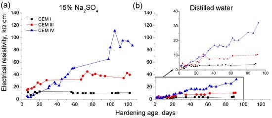 Changes with time of electrical resistivity for CEM I, III and IV grouts exposed to: 15% Na2SO4 solution (a); and distilled water (b).