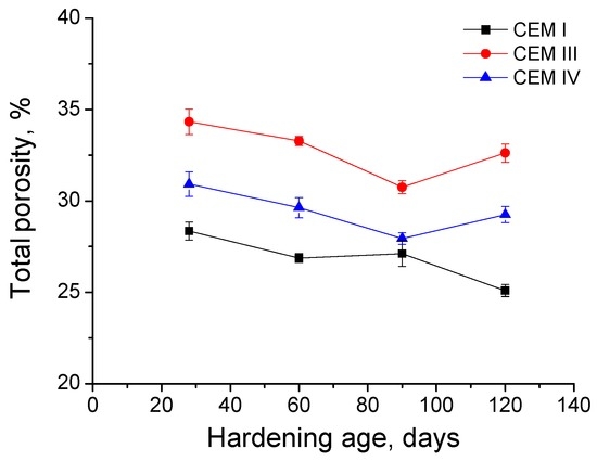 The total porosity of grouts showed different results for each storage condition and cement type (see Figure 10). The total porosity of CEM I grouts was very similar for both media studied, and this could be related to the development of clinker hydration, especially for those exposed to an optimal condition, as immersion in distilled water. For CEM I grouts in contact with aggressive sulphate solution, the combined effect of clinker hydration and the pores silting caused by the precipitation of sulphates and other salts, as consequence of C3A reactions, could play an important role in their total porosity results. The beneficial effect of optimum hardening condition was more prominent for CEM III samples, and the immersion in distilled water would favour the development of slag hydration and new solids formation [,], as suggested the great fall of their total porosity with age, compared to those submerged in sulphate solution, in which the formation of expansive products would hinder a more considerable decrease of porosity. Finally, in relation to CEM IV grouts, the lowest total porosity corresponded to those hardened in contact with sulphate solution. This result could be due to the possible effect of Na2SO4 as an activator of pozzolanic reactions of fly ash, and it is agreement with other authors [,].