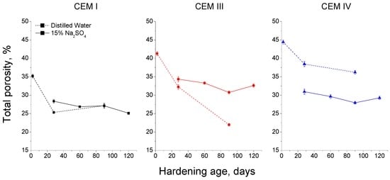 Comparison of total porosity results obtained for CEM I, CEM III and CEM IV grouts exposed to distilled water (dotted line) and 15% Na2SO4 solution (continuous line).