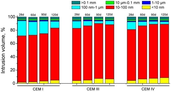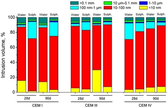 Depending on the hardening medium, the development of grouts microstructure showed differences, as can be observed in Figure 12. For CEM I and CEM III samples, the refinement of porous network was greater for those immersed in distilled water, as stand out the relatively high percentage of pores with diameters less than 10 nm. On the other hand, for CEM IV grouts at 28 and 90 days, respectively, the microstructure was more refined for those exposed to sodium sulphate solution, showing a larger percentage of pores smaller than 100 nm.