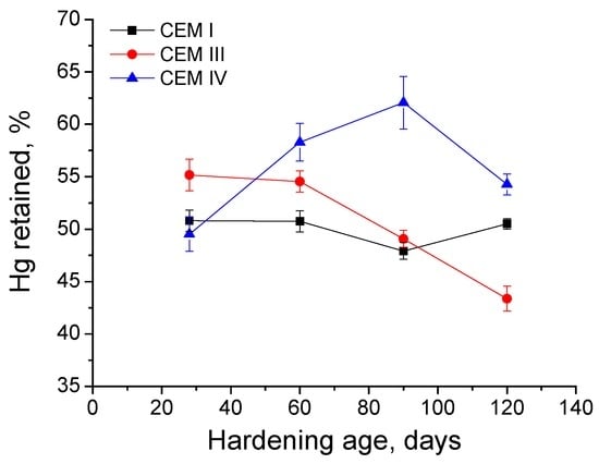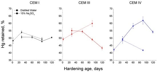 With respect to percentage of Hg retained in the samples at the end of the experiment for grouts exposed to 15% Na2SO4 solution (see Figure 13), this parameter kept practically constant for CEM I samples. Nevertheless, for CEM III ones, Hg retained decreased with time, mainly from 90 to 120 days, when it showed the lowest value of this parameter of all studied cements. The Hg retained increased until 90 days for CEM IV grouts and fell between then and 120 days, although at that age, its value was the greatest of all analysed grouts.