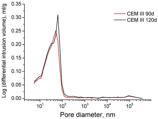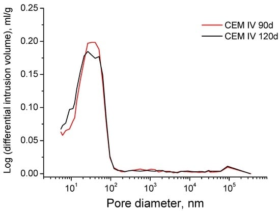 In order to check the results of abovementioned non-destructing techniques, the microstructure of the grouts was also characterized using the classical mercury intrusion porosimetry, despite its drawbacks [,]. The tests were performed with a porosimeter model Autopore IV 9500 from Micromeritics (Norcross, GA, USA), which allows determining pore diameters between 5 nm and 0.9 mm. Before the test, samples were oven dried for 48 h at 50 °C. For each testing age, two measurements were made on each material, and the samples were obtained from disks of 1 cm- and 2 cm-thickness. Total porosity, pore size distribution and percentage of Hg retained at the end of the experiment were studied. For specimens immersed in distilled water the tests were performed at 2, 28 and 90 days of age, and for those exposed to sodium sulphate solution the testing ages were 28, 60, 90 and 120 days.
