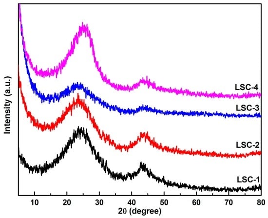 The XRD patterns of the four porous carbon samples reveal the absence of sharp and strong peaks (as shown in Figure 1), indicating the amorphous state of all the LSC samples. On one hand, one broad peak located at about 23° and a weak peak located at 44° were the characteristic peaks of amorphous graphitic carbon, suggesting a limited degree of graphitization of LSC samples. On the other hand, the appearance of the weak peak centered at 44° indicated the improvement of the electrical conductivity. Especially, a slightly sharper peak observed at 44° for LSC-1 suggested the enhanced graphitization degree of LSC-1 compared with the other samples.