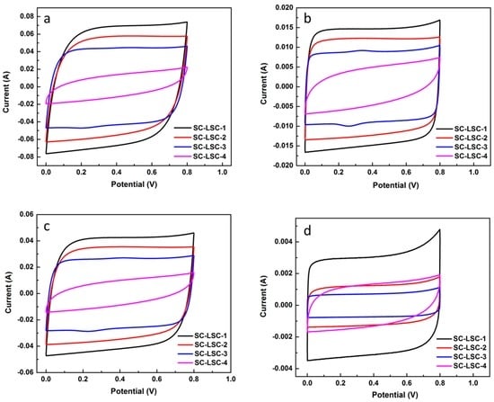 Cyclic voltammetry (CV) curves of LSC-based supercapacitors (SC-LSCs) at different scan rates (mV·s−1): (a) 20; (b) 100; (c) 300; and (d) 500.