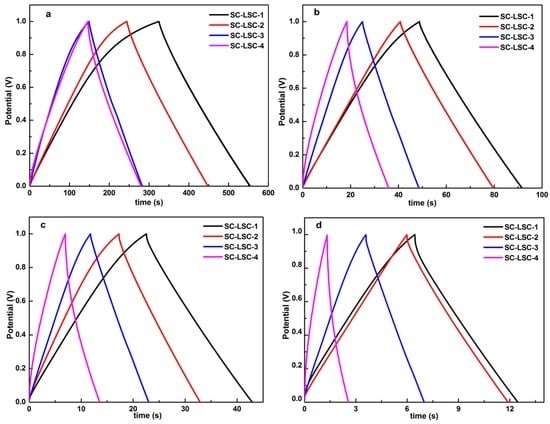 Galvanostatic charge–discharge (GCD) curves of SC-LSCs at different current densities (A·g−1): (a) 0.1; (b) 0.5; (c) 1; and (d) 3.
