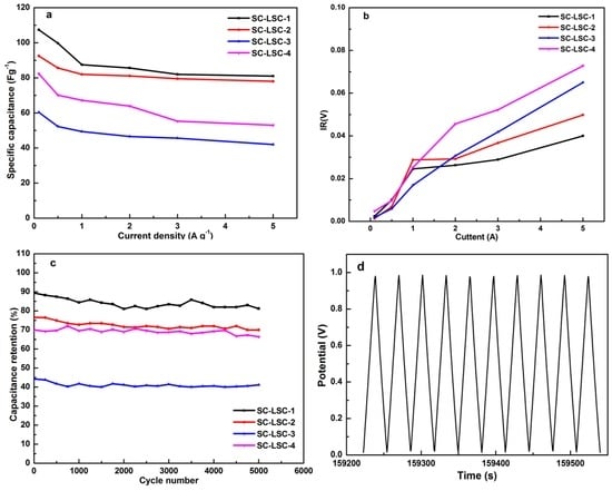 The GCD curves of all the SC-LSCs are shown in Figure 4, the electrodes of which show a typical triangular shape, although imperfect symmetry with a small IR drop. According to the discharging profiles (Figure 4a), based on the charge–discharge curves, the specific capacitance of LSC samples can be calculated by the following formula: