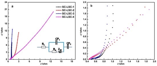 For supercapacitors, the relevant frequency behavior and equivalent series resistance (ESR) are usually assessed with the powerful tool of EIS [41,42]. For the purpose of learning more about the electrodes with remarkable power performance, the Nyquist plots (Figure 6a) of the SC-LSCs were characterized in a frequency ranging from 0.01 Hz to 100 KHz. According to the enlarged plot curves shown in Figure 6b, a semicircular shape was seen at high frequency, while a drastic increase in the imaginary part of the impedance was seen at a lower frequency. In the high frequency range, the left plot intersection at the real part (Z’) is associated with the electrolyte resistance (Rs) and the square resistance of all the SC-LSCs. The semicircle region of the plot curve for each SC-LSC accounts for the charge transfer resistance (Rc), which indicates the migration rate of hydrated K+ and OH− ions in SC-LSCs at the interface between the solution and the electrode surface.