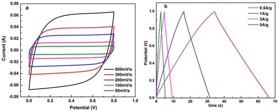 The electrodes were composed of 5 wt % PTFE, 10 wt % acetylene carbon black, and 85 wt % porous carbon active materials [35,41]. All materials were mixed uniformly and then pressed onto a nickel foam substrate at 1.4 MPa, followed by drying in a vacuum oven at 110 °C for 12 h. The amount of active materials on each current collector was about 4.7 mg·cm−2. Symmetrical two-electrode cells were assembled with aqueous 6 M KOH electrolyte isolated by a porous membrane. Cyclic voltammetry (CV), galvanostatic charge–discharge (GCD) and electrochemical impedance spectroscopy (EIS) tests were employed to study the capacitive performance of the samples. The EIS spectra were measured at open circuit potential in the frequency range of 0.01 Hz–100 KHz with the amplitude of 5 mV. All the electrochemical measurements were performed on an electrochemical workstation (CHI760e, CH Instrument Inc., Austin, TX, USA). All the tests were conducted at room temperature.