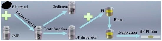 Several approaches have been proposed to fabricate multi- and few-layer 2D materials, such as liquid exfoliation, chemical vapor deposition, and mechanical cleavage [39,40]. Each method has its own advantages and application fields. Among them, the liquid exfoliation method is a simple but quite effective technique for preparing low-dimensional nanomaterials from their bulk crystals under an ambient atmosphere [19,41,42,43]. Herein, the multi-layer BP nanosheets are also prepared via the liquid exfoliation method, as depicted in Figure 1. First, the bulk-state BP crystal (50 mg) is added into an NMP solution (30 mL), and the mixture is then bath-sonicated at 180 W for 4 h with a cell crusher. Second, the dispersion of the BP nanosheets is centrifuged for 5 min at a speed of 500 rpm to remove the unwanted large BP sediment. After that, the upper supernatant BP dispersion is collected to prepare the sample. Third, by mixing the PI with BP nanosheets, a thin BP–PI film can be obtained by evaporating the dispersion on a petri dish.