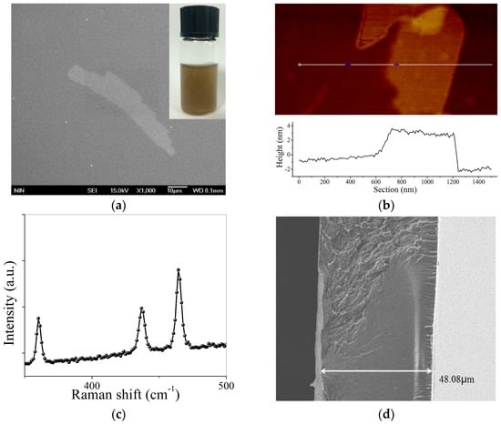As shown in the inset of Figure 2a, the BP suspension exhibits a faint brown color and is quite stable over dozens of days. The scanning electron microscope (SEM) image in Figure 2a illustrates that the width and length of the as-prepared BP nanosheets range from 0.5 µm to 10 µm. It is closely related to the centrifugation rate in the fabrication process. As shown in Figure 2b, the thickness of most BP nanosheets is given as ~4 nm from the atomic force microscopy (AFM) result. The thickness single layer BP is ~0.6 nm [21], which implies that the as-prepared samples are multi-layer BPs. The BP sample is further identified from the Raman spectrum. As depicted in Figure 2c, three peaks at 360.2 cm−1, 436.9 cm−1, and 464.3 cm−1 that correspond to , B2g, and vibration modes of the BP, respectively, are clearly observed on the Raman spectrum. The side profile of the BP–PI film is shown in Figure 2d, which shows a thickness of 48.08 µm. The experimental results indicate that BP nanosheets and the BP–PI film was successfully prepared using the proposed method.