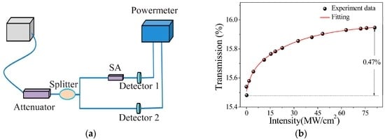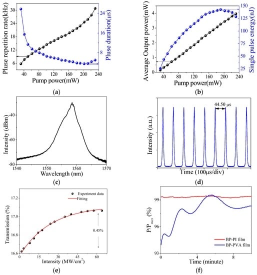 The saturable absorption property of the BP–PI film was measured by a balanced twin-detector technique, as described in Figure 3a. The illumination pulse was generated from a passively mode-locked fiber laser, and the optical intensity was adjusted by an attenuator. After that, the pulse was split equally with a fiber coupler, in which one branch worked as a reference beam and the other branch was inserted with the prepared sample. By comparing the pulse intensities of the two branches, the transmission of the film versus the pulse intensity was obtained [44]. As depicted in Figure 3b, the BP–PI film exhibited typical characteristics of an SA in that the transmission increased with pulse intensity. Based on the fitting results, the modulation depth of the BP–PI film was 0.47%.