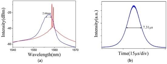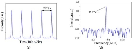 When the pump power reached 25.07 mW, a continuous laser was obtained without inserting the BP–PI film in the resonator, as the red curve shows in Figure 5a. After inserting the BP–PI SA, self-started stable Q-switched pulses were observed in the fiber laser when the laser pump approached 31.78 mW. A typical Q-switched operation at the laser pump of 93.94 mW is plotted in Figure 5. As shown in Figure 5a, the laser spectrum was centered at 1556.93 nm and the 3 dB spectral width was given as 2.66 nm. The pulse profile and typical pulse train are shown in Figure 5b,c, which shows a pulse duration of 7.31 μs and a pulse interval of 79.23 μs, respectively. The radio-frequency spectrum in Figure 5d shows that the pulse operated at a repetition rate of 12.87 KHz, in agreement with the pulse–pulse interval.