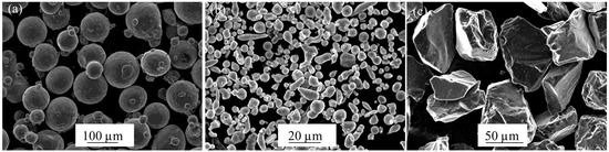 The starting powder materials are an important topic of study in the analysis of composite materials. In this work, a spherical titanium matrix powder (grade 1), manufactured by AP&C (Quebec, QC, Canada), was used. To form the reinforcing phases, boron carbide particles were selected (manufactured by ABCR GmbH & Co. KG, Karlsruhe, Germany). Moreover, the presence of in-situ TixAly based intermetallic was a main goal of this research. For this reason, elementary aluminium and fine titanium powder were used as raw materials. In this way, this raw materials blend led to an expected Ti-Al intermetallic (manufactured Ti powder by TLS and Al powder by NMD GmbH, Laufen, Germany) [19]. One of the main advantages of using mixed powders instead of prealloyed powders is improved densification. In order to achieve a complete Ti-Al reaction to form intermetallic compounds, Ti fine powder was selected. Hence, the small particle size powder had a high diffusion rate, which was beneficial to the Ti-Al reaction. The different morphologies of the starting powder materials are shown in Figure 1. Characterization of all the raw materials was performed to verify the information supplied by the manufacturer about the size and morphology of the powders (see Appendix A).