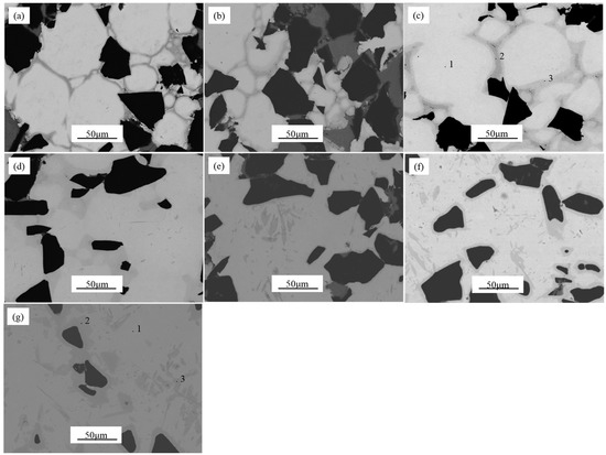 SEM images of the specimens produced at different processing temperatures: (a) 900 °C; (b) 950 °C; (c) 1000 °C; (d) 1100 °C; (e) 1200 °C; (f) 1300 °C and (g) 1400 °C.