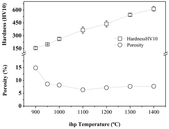 By increasing the temperature, variations of densification and hardness of the specimens were expected (see Figure 8). Due to the short processing time (5 min), any temperature increment significantly enhanced the composites’ densification. In Figure 8, we can observe the trend of hardness (HV10) and porosity (determined by image analysis) of the specimens versus the iHP processing temperature. As is well-known, as the processing temperature increased, better specimen densification was obtained. Hardness behavior was also determined by an increase with processing temperature.