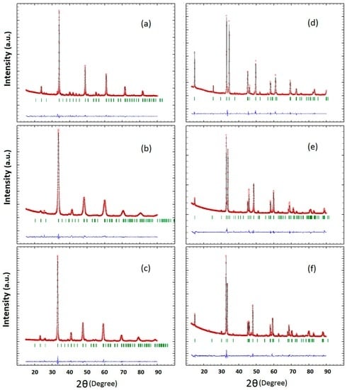 Powder X-ray diffraction (XRD) patterns were obtained with a Bruker D8 diffractometer (Karlsruhe, Germany) using monochromatized Cu Kα radiation. Phase identification and lattice parameters have been analyzed by Rietveld profile fitting using the program suite FullProf 2.00. The backgrounds in the Rietveld refinement were fitted with a 12-coefficient Fourier-cosine and the peak shapes were modeled by a pseudo-Voigt profile. Bond distances and angles were extracted using Bond_Str of the FullProf Suite (Version Jan 2015) and unit cell volumes were obtained using Powder Cell 2.4.