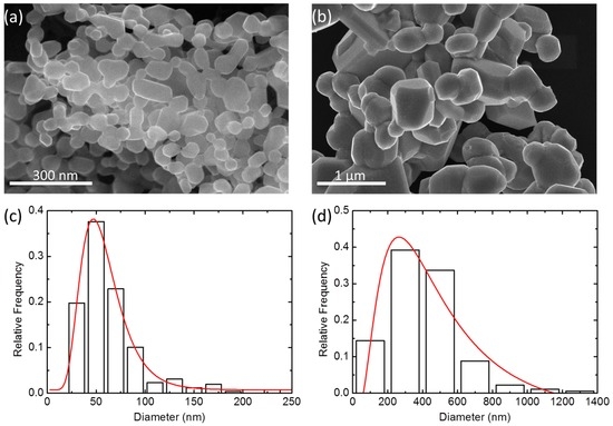 Scanning electron microscopy (SEM) was performed using an FEI Nova Nano SEM 650 (Hillsboro, OR, USA) operated at 5 and 15 keV, where a through-lens detector was used. The specific area of the particles was calculated by assuming an elliptical shape and defining an effective diameter as de = (d2 × d1)0.5, from which the specific area was obtained as A = 6/ρ Σde2/Σde3 [55]. The density ρ was calculated using the unit cell parameters in Table 1.