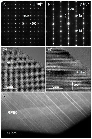 Figure 4a,c show electron diffraction (ED) patterns of P50 and RP50 along [010]* and [110]* zone axes, respectively. The diffraction patterns were completely indexed based upon the space groups Pnma (no. 62) for Ca1−xPrxMnO3 (P-PCMO) and Fmm2 (no. 42) for Ca2−xPrxMnO4 (RP-PCMO) and using the unit cell parameters determined by powder XRD. The presence of diffuse streak lines parallel to the [001] direction and forbidden spots in ED patterns in RP-PCMO can be explained by the numerous violations of layer sequence by individual Pr layers or even PCMO intergrowths, visible in the HRTEM image in Figure 4d and the STEM overview image in Figure 4e.