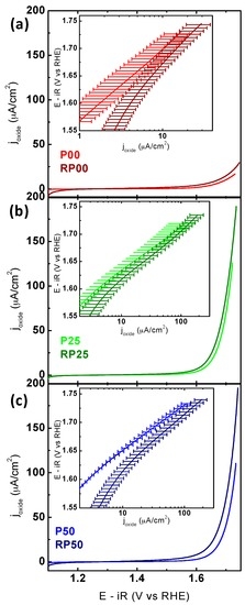 Moreover, similar Tafel slopes of ring and disk current suggested that side reactions did not affect the disk currents of RP25, RP50, and P50 in this range (Figure S4). Significant deviations between the Tafel slope of ring and disk electrode indicates additional processes such as corrosion or possibly oxygen evolution from the oxide itself as Tafel slopes at the ring electrode are smaller than the respective disk Tafel slopes particularly for P00 (Figure S4).