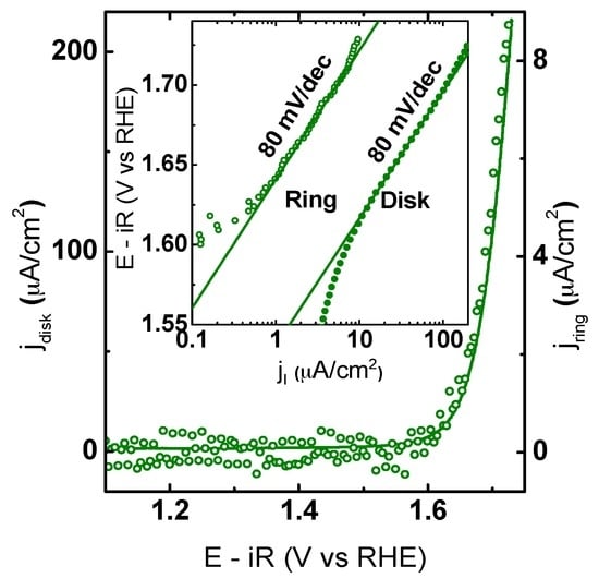 Additional RRDE experiments were performed in Ar-saturated electrolyte to verify OER activity. The Pt ring electrode was constantly held at 0.4 V vs. RHE to probe for O2. Ring CV measurements and calibration data are shown in Figure S3. In the RRDE experiments, oxygen generated at the disk moved to the ring by forced convection, where it was reduced under mass limiting conditions, i.e., the ring current only depends on concentration of oxygen. Under the used conditions, the ring currents solely responded to the dissolved oxygen [49]. Therefore, they represent the catalytic current and demonstrate that the exponentially rising currents on the disk of all electrodes above 1.6 V vs. RHE are indeed due to OER as can be seen in Figure 6.