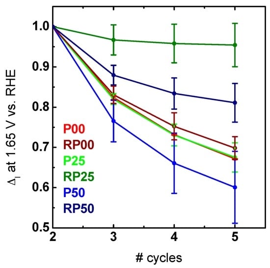 In order to evaluate the stability of the different oxides, the change in the cyclic voltammograms was analyzed (Figure S5). Here we used the current density at a potential of 1.65 V vs. RHE relative to the second cycle shown in Figure 7. The potential was chosen to avoid the background currents such as the capacitance at low potentials on one hand and bubble formation at high potentials on the other hand. Pr-containing samples of the RP phase decayed less than the respective Pr-containing samples of the P-series (Figure 7). The difference in the stability even for the most active P sample might be due to additional processes as can be seen by the different Tafel slopes. Interestingly, the most active sample in our study (RP25, Table 3) was also the most stable one with a decrease of activity below 5%. The result of the most active in addition to be the most stable sample has been rarely observed and is in contrast to other reports [50,51] in which higher activity always results in lower stability.