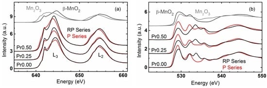 The surface electronic state of perovskites is assumed as a descriptor of the OER, where specifically the eg orbital filling of the TM cation and the covalency of the TM-O bond [20,48] are used in a rigid molecular orbital model. Herein, this method has been used for the study of a correlation between OER activity and orbital characteristics obtained by XAS experiments from our doping series of P- and RP-phases. Mn-L3,2 edge spectroscopy probes the manganese 2p to 3d electronic transitions. The Mn-L3,2 edge spectra of the P- and RP-systems exhibit shapes typical for those of mixed MnIII/IV oxides, while differences only in minor details are observed in the samples with the same Pr-stoichiometry (Figure 8a). The Mn-L3 edges showed peaks at ~642 eV and ~645 eV as can be found in mixed MnIII,IV oxides. Position, shape and height of these peaks depend on the ligand field-splitting parameter [52] and the fraction of MnIII in the sample. The energy position of these peaks is insufficiently described by linear combination of the spectra of MnIII2O3 and β-MnIVO2, which prompted us to perform further investigations on the electronic structure.
