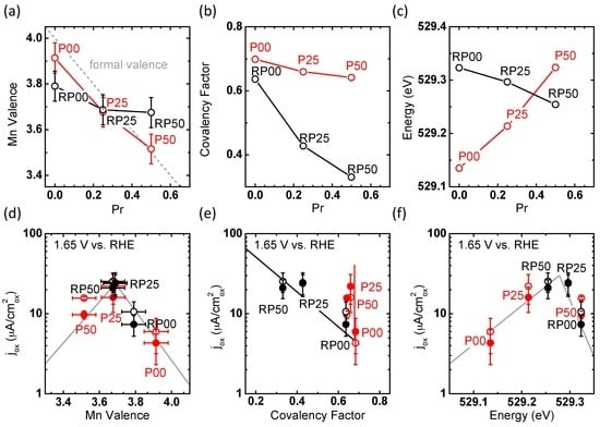 Next, we discuss the observed correlation between the determined effective electronic parameters and the OER current density at 1.65 V (Figure 9d–f) during the 2nd and 5th cycles which allows discussion of stability in addition to OER activity. Trends in activity are often correlated with eg occupancy in recent literature. The total eg occupancy is calculated straightforwardly from the Mn valence, which is 1 for MnIII and 0 for MnIV (i.e., eg = 4 − valence). Our samples show a maximum activity near a Mn valence of 3.7, i.e., a total eg occupancy of 0.3 (Figure 9d), while the optimum activity in a previous work on perovskite oxides [48] was obtained at eg filling of ≈1.2 (for a Co-Fe perovskite). Yet, the potential at 50 µA/cm2 of 1.68 ± 0.01 V vs. RHE for the RP25 system (0.3 eg electrons) is similar to 1.65 ± 0.03 V for La0.5Ca0.5MnO3 (nominally 0.5 eg electrons) in Suntivich et al. [48]. Thus, our work provides further evidence that the total eg occupancy is not solely a suitable activity descriptor [20,54]. Figure 9e suggests that in addition to Mn valence, the effect of varying the covalency factor must be taken into account. Here, it can only be analyzed for RP oxides having a similar valence state of 3.7 and thus similar total eg orbital occupancy of 0.3. For these samples, a lower covalency factor increases the OER activity (Figure 9e), which is inconsistent with the previous results for perovskite oxides at eg occupancy of ~1 [20,48].