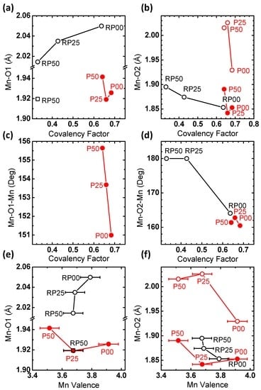 Correlation between Mn-O(1) and Mn-O(2) bond lengths, Mn-O(1)-Mn and Mn-O(2)-Mn bond angles as determined from Rietveld refinement with (a–d) covalency factor and (e,f) Mn valence.