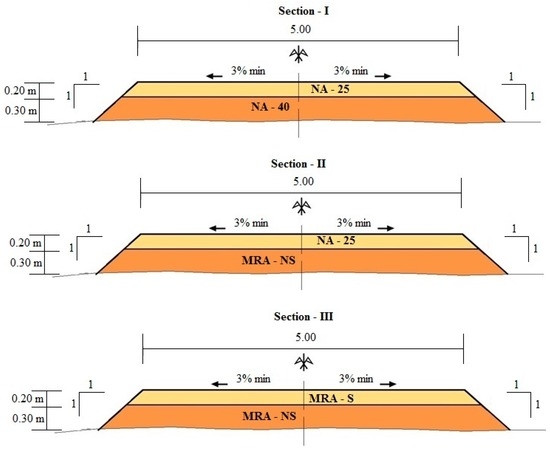Structural layers of Section I were chosen as reference, Section III was carried out to evaluate the behaviour of MRA with respect to NA, and Section II was chosen to evaluate the behaviour of the subbase layer of MRA in case of finding structural failures in Section III.