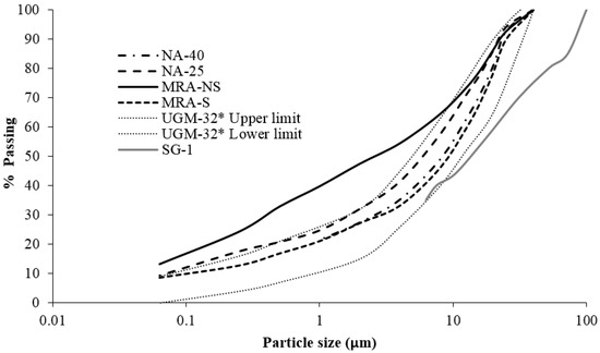 Particle size distribution. * UGM-32 = Unbound granular material. Maximum aggregate size is 32 mm.