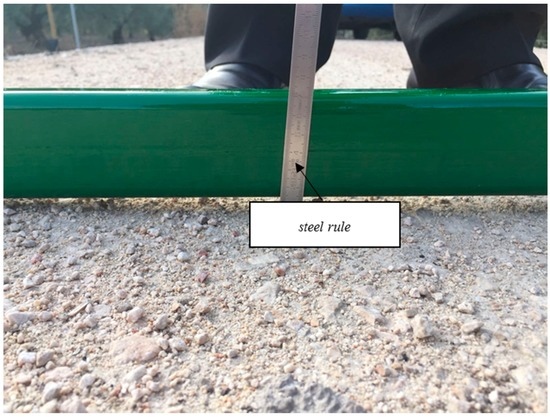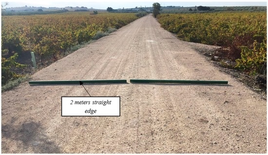 One of the most useful tests in assessing the possible failure or degradation of the pavement of a road is the measurement of rut depth on its surface. The permanent vertical deformations of the road surface along the unpaved rural road were registered following the standard of ASTM E1703/1703M [54]. This test was carried out in October 2016.