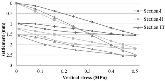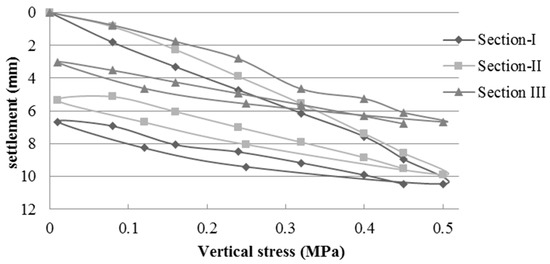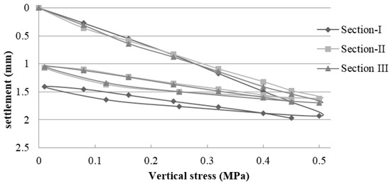 Based on the data obtained by the PLT, the elastic modulus was calculated for each load cycle. Table 4 shows the elastic modulus values in the second load cycle in each of the test sections according to NLT 357/98 standard [52]. Figure 6, Figure 7 and Figure 8 show the vertical stress-settlement diagrams of the subgrade, subbase, and base layers in each experimental section. The results are the average of two measurements per section.