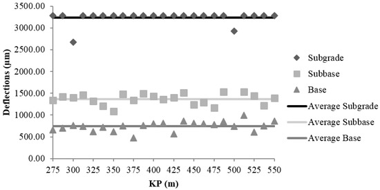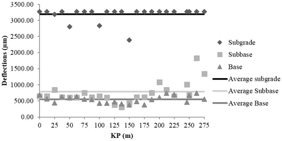The main FWD contribution is the analysis of the bearing capacity by reverse calculation of the modulus of elasticity values of the road layers based on the registered deflections. The deflections were measured with a Dynatest HWD 8081 deflectometer (manufactured by Dynatest, Soborg, Denmark). Figure 9, Figure 10 and Figure 11 show the values of deflection and the average deflection in the subgrade, subbase, and base in each of the sections.