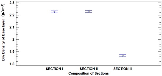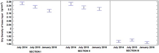 - Section III, which was constructed with MRA, did not exhibit a decrease in the dry density, and there were no significant differences in the densities measured over time. However, sections I and II exhibited significant differences in their dry densities, including decreased density over time. Density loss was mainly due to the base material. Because both sections were made with NA, no significant difference was found between the behaviours of sections I and II, which were differentiated by the subbase material type. Section I was constructed with NA, while the subbase of Section II was constructed with MRA.