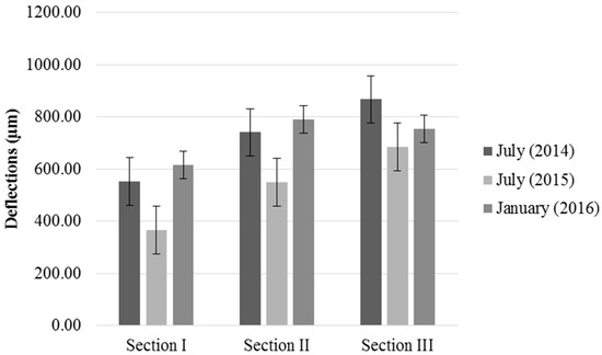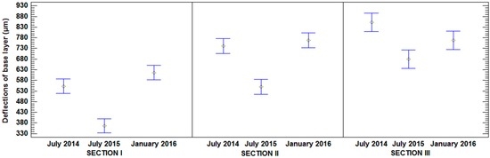 According to overlapping of bars in Figure 16, there were significant differences in deflections measured over time in all sections, although it is appreciated that the tendency of deflections was different between them. Section I and II showed an increase of deflections with the onset of rains and, therefore, increased humidity. Deflections in January 2016 were higher than deflections in July 2014, after the execution of the road. However, this did not happen in Section III, in which the deflections increased in January 2016 compared to July 2015, but did not reach the deflections of July 2014. As in dry density, these results are due to the higher absorption capacity of MRA (Table 1), which alleviates the effects of precipitation and humidity.