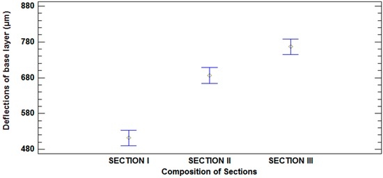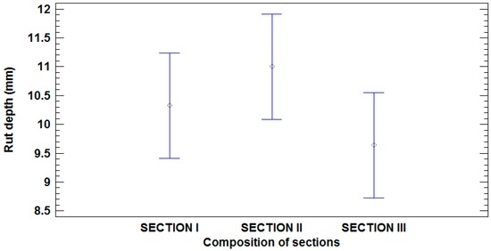 To assess the composition effect of sections on rut depth, a similar ANOVA was performed. Table 11 presents a summary of these results, finding statistically non-significant differences between those levels that share overlapping bars (Figure 18).