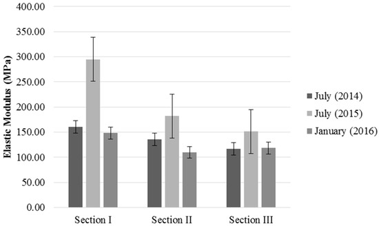 All of the elastic modulus values complied with the requirements of PG-3 [22] (>80 MPa). In Section I, the elastic modulus decreased to 148.2 MPa in January 2016, a reduction of 7.62% from July 2014. In Section II, the elastic modulus was 109.9 MPa in January 2016, a decrease of 18.72% from July 2014. In Section III, the elastic modulus was 118.2 MPa in January 2016, a decrease of 1.04% compared to July 2014. The increase in the elastic modulus in Section III is due to the pozzolanic activity or hydraulic properties of the RA cement [10,57,58].