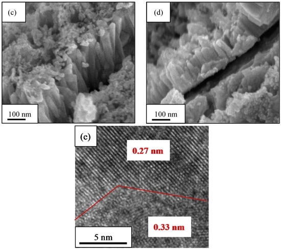 After electrodeposition and dip-coating methods, TiO2-ZnO can be found on both sides of the electrode. Each additional dip-coating cycle produced a small change in TiO2-ZnO thin film morphology (Figure 1). Meanwhile, Figure 2 shows the schematic diagram of dip-coating method for the formation of TiO2 loaded-ZnO. Average compositional ratio for ZnO, one-cycle dip-coating TiO2-ZnO, two-cycle dip-coating TiO2-ZnO, and three-cycle dip-coating TiO2-ZnO are shown in Table 2 using EDX spectroscopy analysis. From here, samples are named after the titanium atomic percentage (at %). One-cycle dip-coating TiO2-ZnO, two-cycle dip-coating TiO2-ZnO, and three-cycle dip-coating TiO2-ZnO are named 0.25 at %, 0.50 at %, and 1.0 at %, respectively. FESEM images show that all samples were very nearly vertically aligned and were of the average length, diameter and aspect ratio shown in Table 3. In addition, Figure 1a–d shows a decrease in the length and diameter with the increase in dip-coating cycles. This result is attributed to the etching phenomenon by the TiO2 solution which was in an acidic (pH 1–3) solution to maintain the dispersion of TiO2. From the HRTEM result, there was a boundary that split the two different materials (Figure 1e). This was confirmed by the lattice spacing by each material: 0.27 nm (ZnO (002)) and 0.33 nm (TiO2). In addition, the existence of the two different materials could be recognized by the arrangement of atoms in different directions.