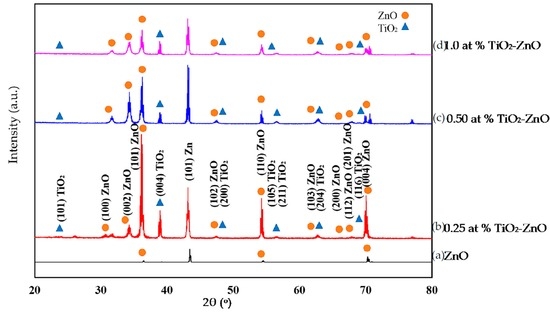 XRD pattern of (a) ZnO; (b) 0.25 at % TiO2-ZnO; (c) 0.50 at % TiO2-ZnO; and (d) 1.0 at % TiO2-ZnO.