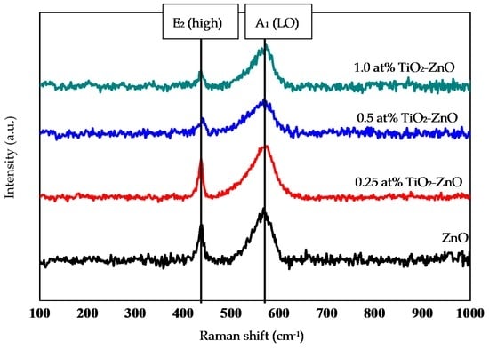 Raman scattering of ZnO, 0.25 at % TiO2-ZnO, 0.5 at % TiO2-ZnO, and 1.0 at % TiO2-ZnO.