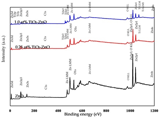 Full XPS survey spectra of ZnO, 0.25 at % TiO2-ZnO, and 1.0 at % TiO2-ZnO.