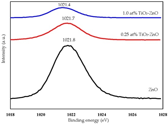 XPS spectra Zn2p of ZnO, 0.25 at % TiO2-ZnO, and 1.0 at % TiO2-ZnO.