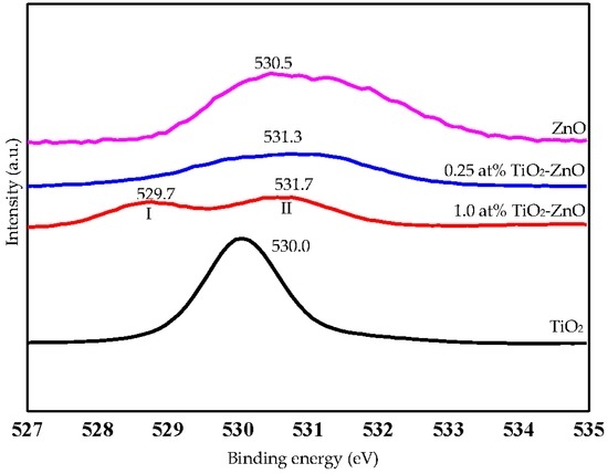 Referring to Zhang et al. and Al-Gaashani et al., O1s binding energies at 530.4 eV, 531.4 eV, and 532.4 eV are O2− species in the lattice (OL), oxygen vacancies and defects (Ov), and chemisorbed or dissociated (Oc) oxygen species, respectively [46,47]. Meanwhile, the O1s binding energies associated in all samples in this research work are 530.5 eV (ZnO), 529.7 eV and 531.7 eV (1.0 at % TiO2-ZnO), 531.7 eV (0.25 at % TiO2-ZnO), and 530.0 eV (TiO2). It can be clearly seen that all O1s curves were asymmetric; therefore, both lines were fitted with two Gaussian peaks (I and II) (Figure 7 (1.0 at % TiO2-ZnO)). Peak I of O1s was located in the lower binding energy, as compared to peak II. Peak I was assigned for the O2− ions of the Zn-O bonding at the crystal lattice (OL) [46,48]. For peak II (1.0 at % TiO2-ZnO), the location of 531.7 eV is located in between oxygen vacancies defect (531.4 eV) and existence of hydroxyl group (532.4 eV). From the EDX result, it was confirmed that O at % is reduced with the increase in the dip-coating cycle (Table 2). However, the existence of –OH group is accepted as Zn-OH formed before the formation of ZnO. These hydroxyl groups helped to prevent the recombination of electron–holes [44,49].