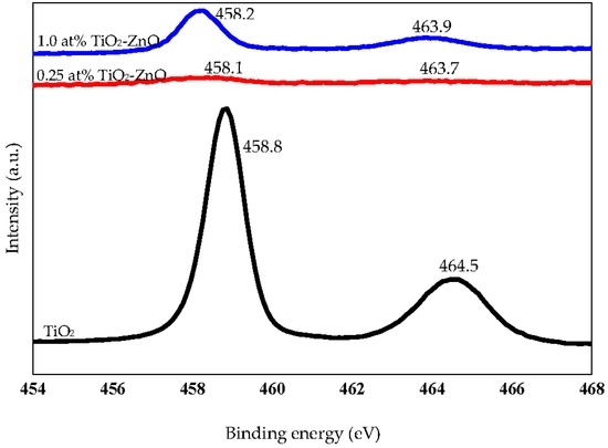 The XPS spectra for Ti2p showed binding energies at 458.8 and 464.5 eV, demonstrating Ti2p3/2 and Ti2p1/2, respectively [50,51,52,53,54,55]. The Ti2p spectra indicated that the Ti in TiO2-ZnO were all in a Ti4+ state, but the heterogeneous environments of Ti4+ resulted in the broadening of the Ti4+ 2p in the XPS spectra. There is a slight decrease in the intensity of the Ti2p3/2 peak and a broadening of the Ti2p1/2 with an increase in the Ti/Zn ratio from 1.0 at % to 0.25 at % (Figure 8). This indicated a decrease in the Ti4+ state and the heterogeneous environment due to high intensity of ZnO as compared to TiO2. In addition, we can see that binding energies of TiO2 are shifting to lower binding energies because it has been coupled with the electron rich material ZnO (Figure 8). The existence of C1s belongs to containment carbon during calibration. A summary of XPS spectra is presented in Table 4.