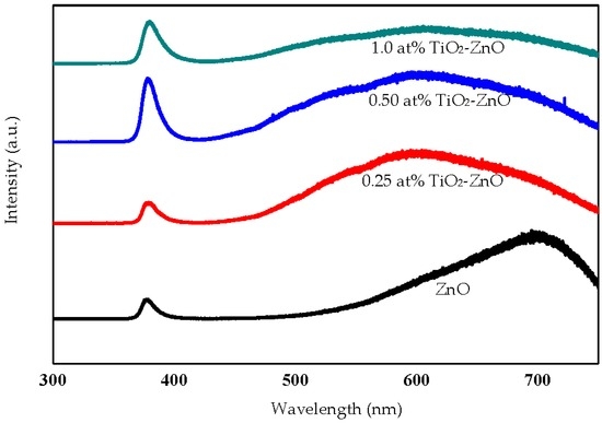 PL spectra of ZnO, 0.25 at % TiO2-ZnO, 0.50 at % TiO2-ZnO, and 1.0 at % TiO2-ZnO (excitation: λ = 514 nm).