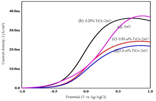 Field Emission Scanning Electron Microscopy (FESEM) JEOL JSM-7600F (Freising, Germany) has been used to study the morphology (including the surface and cross-sectional) of TiO2-ZnO composite thin film. Meanwhile, elemental studies have been carried out using Hitachi Energy Dispersive X-ray Spectroscopy (EDX). The crystallinity, phase transition and photoluminescence spectra studies of TiO2-ZnO composite thin film were carried out via Renishaw In Via Raman microscope and supported by Bruker D8 Advance equipped with EVA-Diffract Software (Karlsruhe, Germany) X-ray Dispersive (XRD) with Cu K radiation and wavelength λ = 1.5418 Å. The photocurrent densities were obtained from photoelectrochemical cell consisted of three-electrodes (TiO2-ZnO nanostructures composite film (anode), platinum electrode (cathode), and Ag/AgCl in saturated KCl electrode (reference electrode)). All electrodes were immersed in 1 vol% ethylene glycol added to 1 M sodium hydroxide (NaOH). Small amount of ethylene glycol has been used as sacrificial agent during PEC procedure. Ethylene glycol worked as electron donor during PEC procedure. It supplied electron with the photogenerated VB holes for increase the electron–holes separation [80]. Light source with AM1.5 filter has been used for both UV and solar illumination (Newport model 74010) focused on the PEC cell. The light intensity was 0.652 Wcm−2. Meanwhile, current-applied potential was measured by using Metrohm Autolab PGSTAT204 (Herisau, Switzerland), with procedure linear sweep voltammetry potentiostatic (−1 to 1 V potential applied). The illuminated area was one-sided and, therefore, active area was 4 cm × 1 cm.