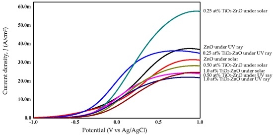 The photocurrent density (mA/cm2) (with V vs. Ag/AgCl) of ZnO, 0.25 at % TiO2-ZnO, 0.50 at % TiO2-ZnO, and 1.0 at % TiO2-ZnO under UV illumination and solar illumination.