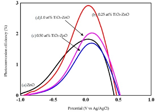 Photoconversion efficiency of (a) ZnO; (b) 0.25 at % TiO2-ZnO; (c) 0.50 at % TiO2-ZnO; and (d) 1.0 at % TiO2-ZnO under UV illumination.