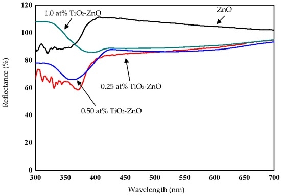 Reflectance spectra of ZnO, 0.25 at % TiO2-ZnO, 0.50 at % TiO2-ZnO, and 1.0 at % TiO2-ZnO.